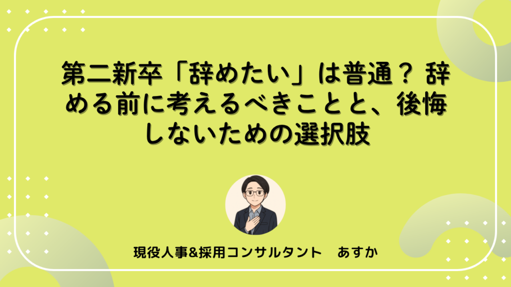 「もう辞めたい…」 新卒で入社した会社を数年で辞めたいと考えているあなたへ。それは決して特別なことではありません。多くの第二新卒が同じような悩みを抱えています。この記事では、第二新卒が「辞めたい」と感じる原因を深掘りし、辞める前に考えるべ... -